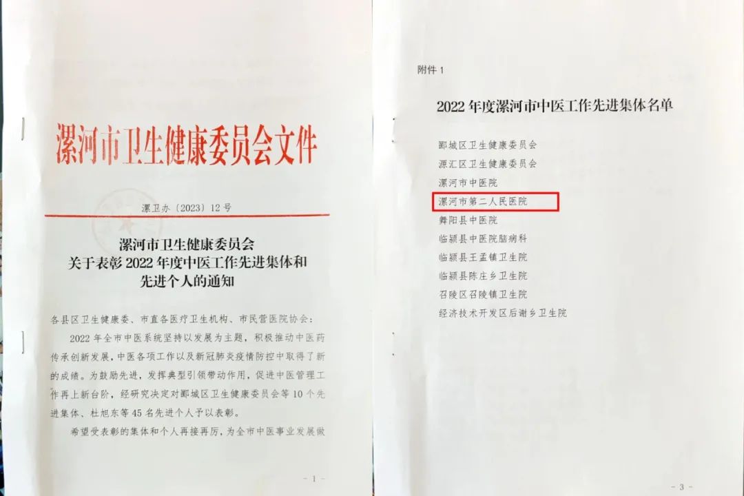 3月2日,市二院被市衛(wèi)健委授予2022年度漯河市中醫(yī)工作先進(jìn)集體榮譽(yù)稱(chēng)號(hào)。
