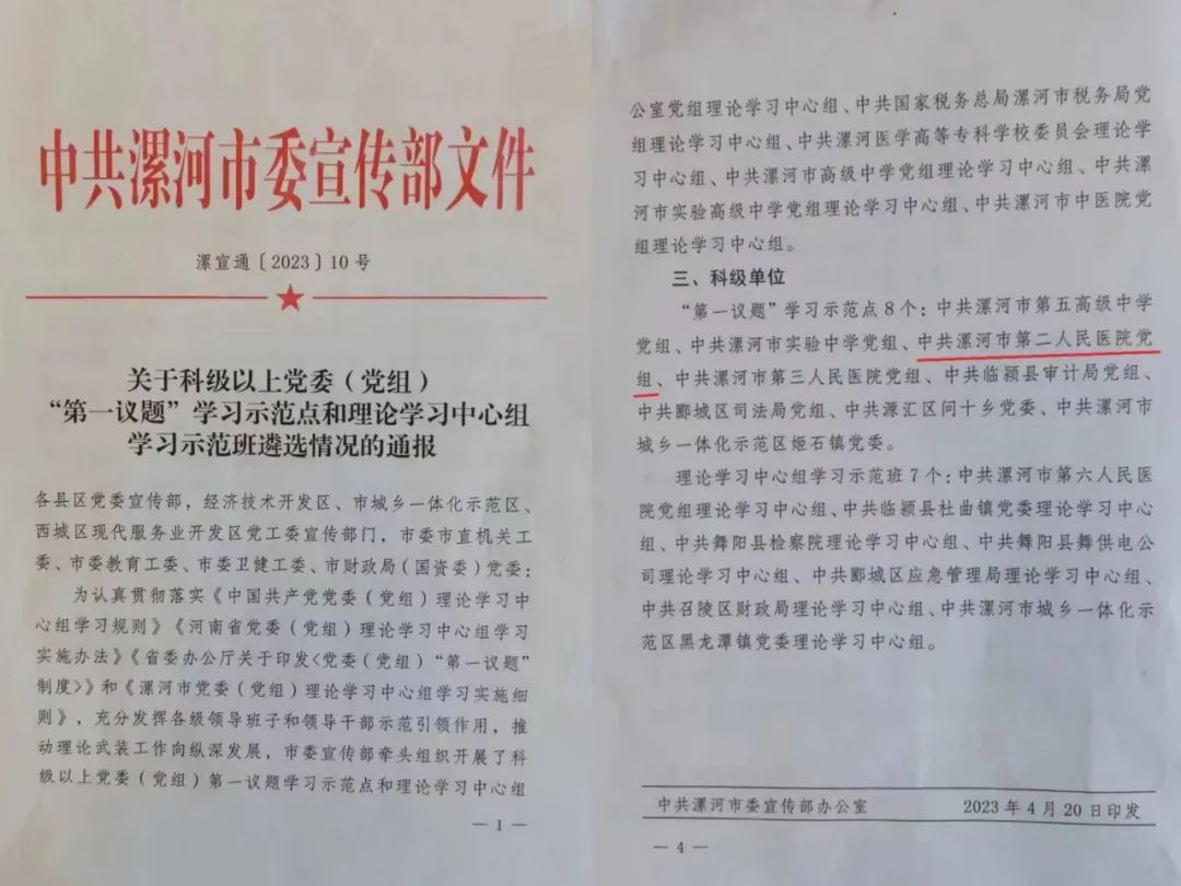 4月26日,市二院黨委被市委宣傳部確定為“第一議題”學(xué)習(xí)示范點(diǎn)稱(chēng)號(hào)。