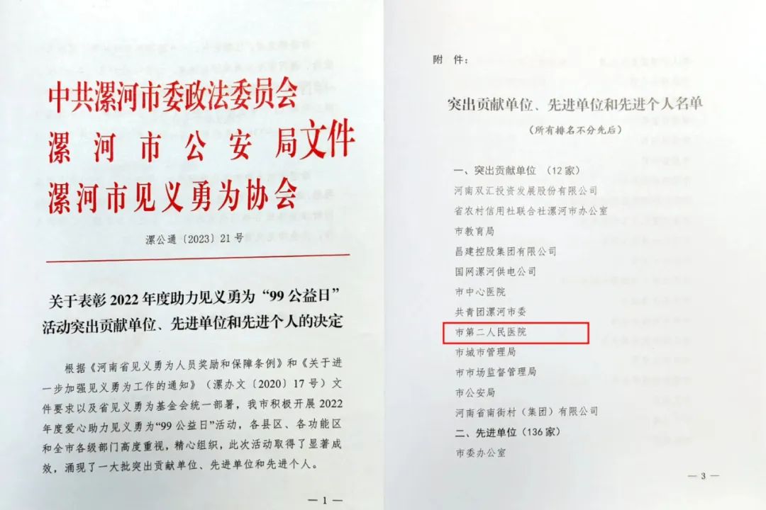 3月29日上午,漯河市見(jiàn)義勇為工作暨“99公益日”表彰會(huì)議召開(kāi),市二院被授予助力見(jiàn)義勇為“99公益日”活動(dòng)“突出貢獻(xiàn)單位”。