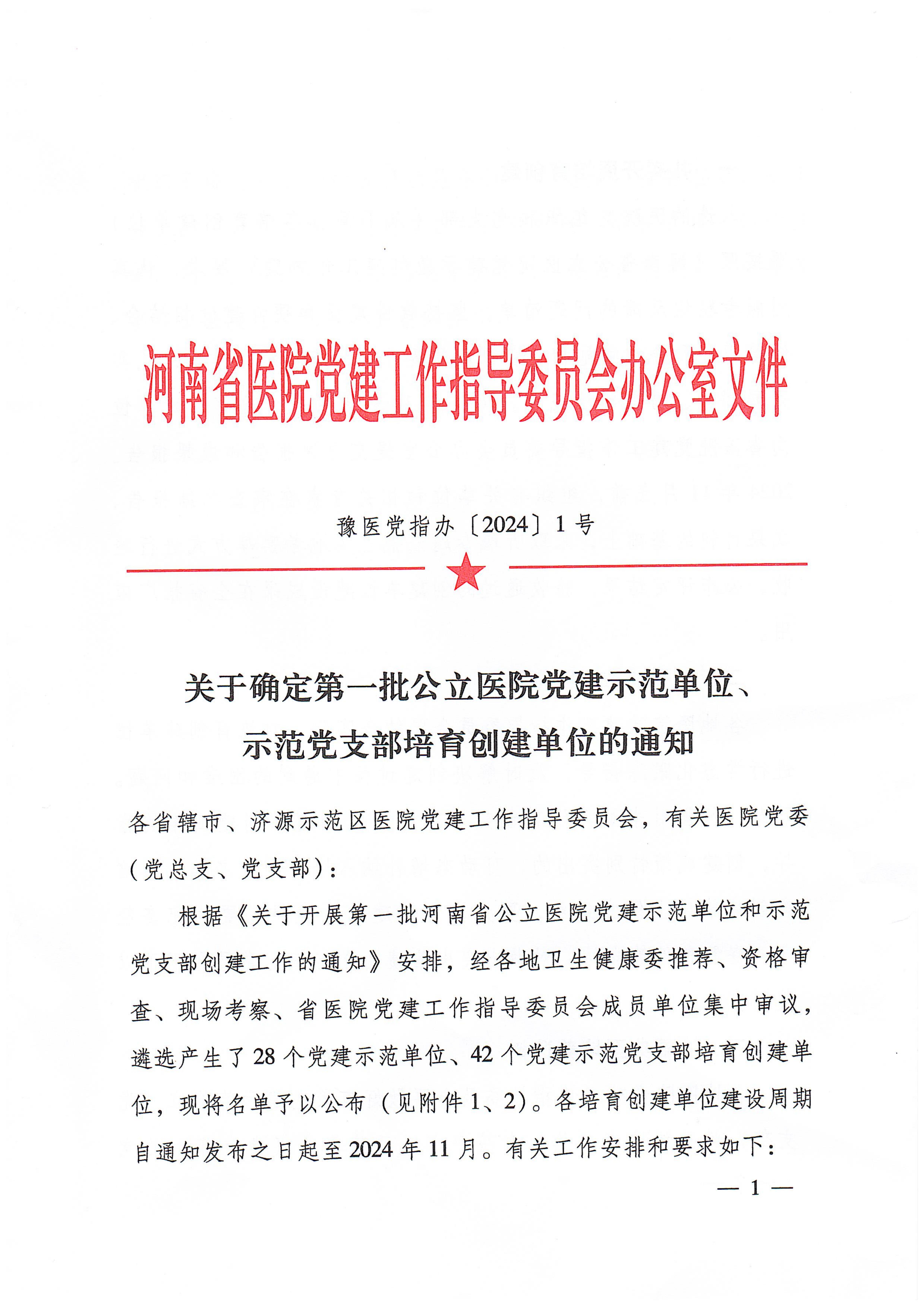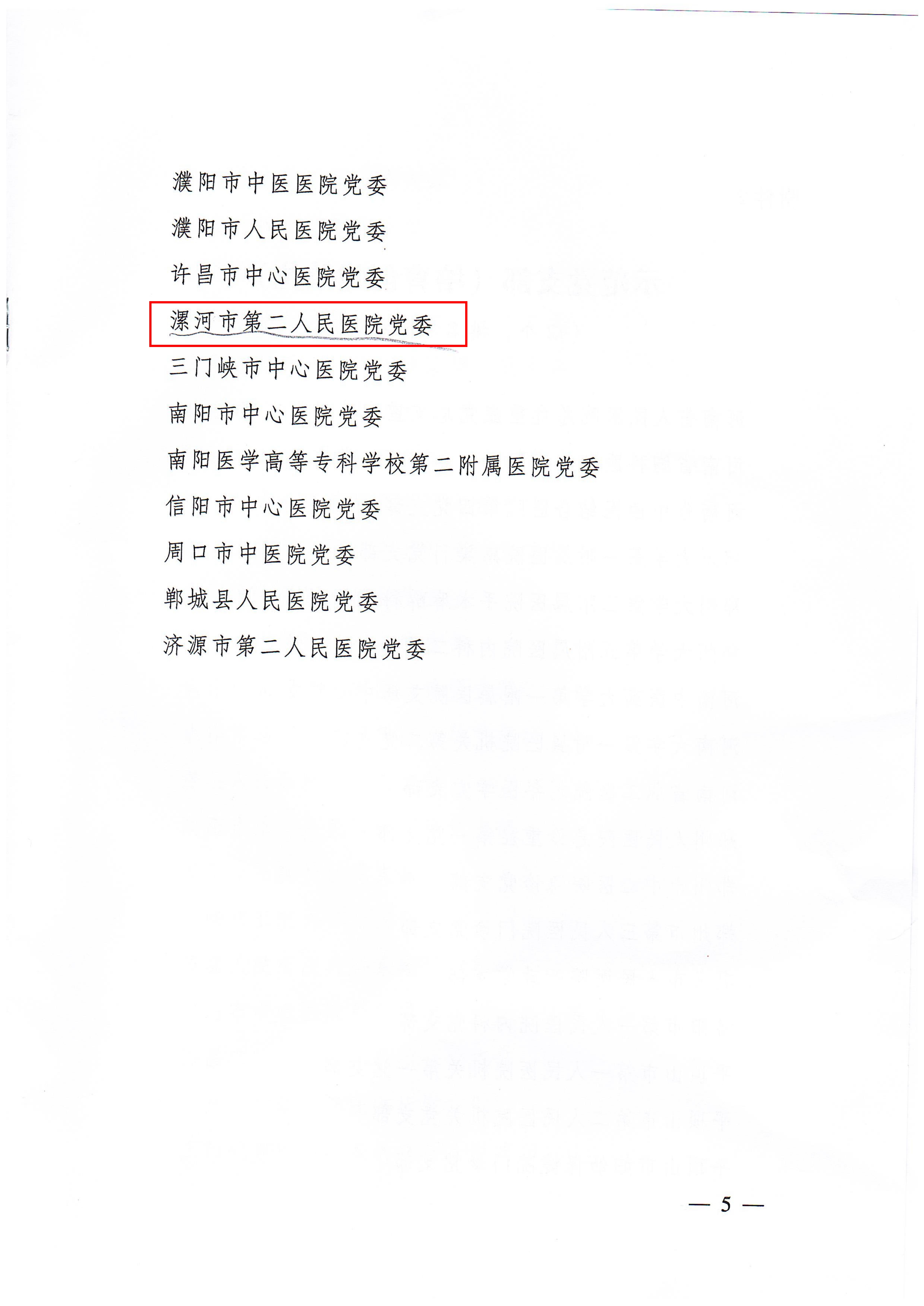 近日,河南省醫(yī)院黨建工作指導委員會下發(fā)《關(guān)于確定第一批公立醫(yī)院黨建示范單位、示范黨支部培育創(chuàng)建單位的通知》,市二院黨委被確定為河南省公立醫(yī)院黨建示范單位(培育創(chuàng)建單位),是全省28個黨建示范單位之一、漯河地區(qū)唯一。