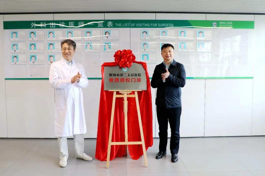 儀式現(xiàn)場(chǎng),黨委書(shū)記魏松與黃宗強(qiáng)教授共同為“漯河市第二人民醫(yī)院骨質(zhì)疏松門(mén)診”揭牌。