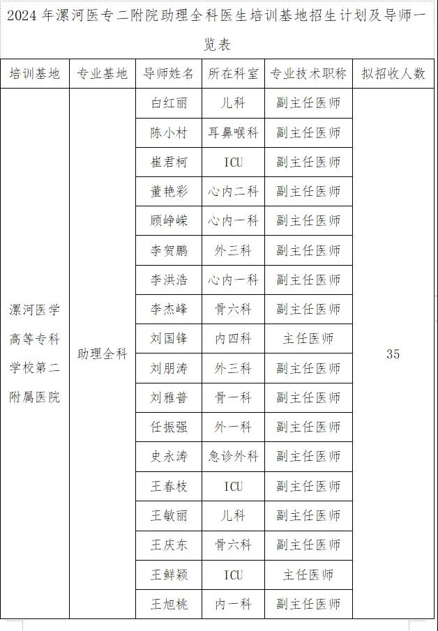 為深入貫徹落實《關(guān)于印發(fā)助理全科醫(yī)生培訓(xùn)實施意見(試行)的通知》(國衛(wèi)科教發(fā)〔2016〕14 號),根據(jù)《河南省衛(wèi)生健康委關(guān)于做好2024年助理全科醫(yī)生培訓(xùn)招收工作的通知》(豫衛(wèi)科教函〔2024〕19號)要求,結(jié)合本院實際,現(xiàn)制定漯河醫(yī)學(xué)高等??茖W(xué)校第二附屬醫(yī)院2024年助理全科醫(yī)生培訓(xùn)招收方案如下: