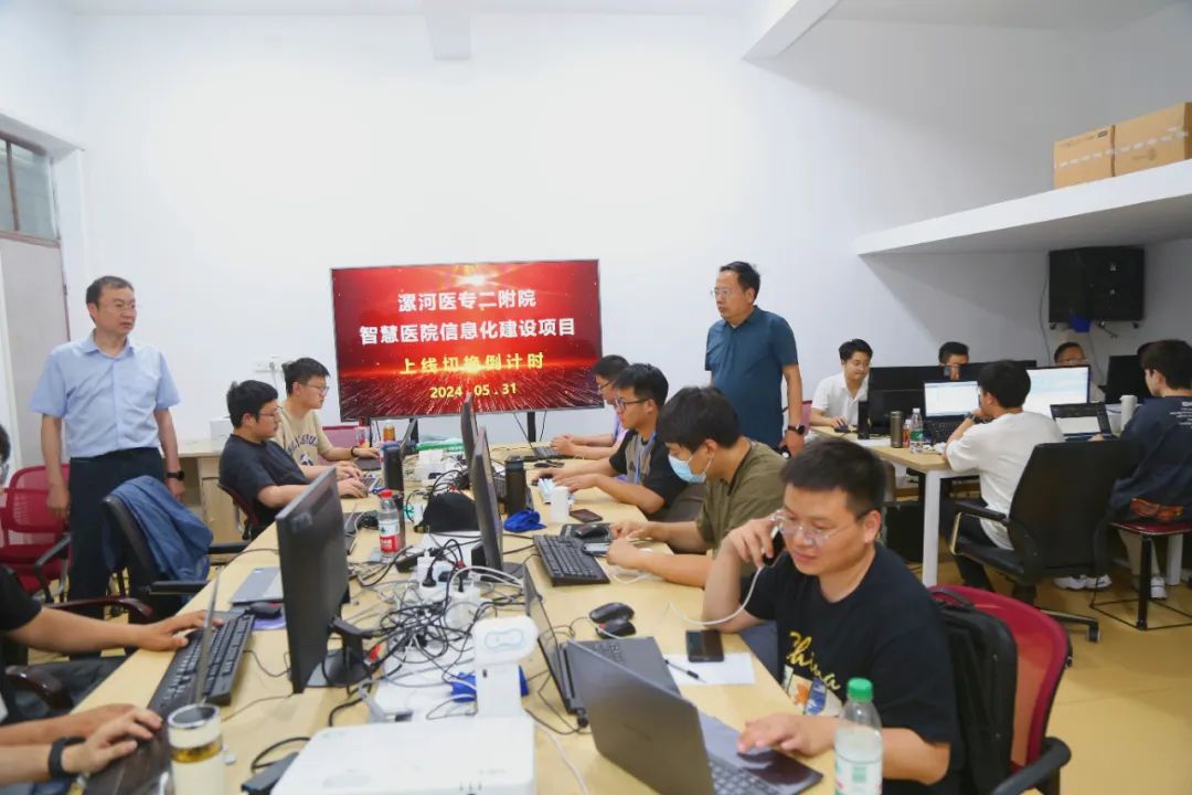 5月31日晚,院長李奎、副院長曹鵬克一行深入信息科、藥房、各臨床科室和醫(yī)技科室檢查新系統(tǒng)切換前的各項工作,一切準備就緒。6月1日零點,新系統(tǒng)正式切換上線。按照預(yù)定安排,軟件工程師們和信息科工作人員全部下沉到各科室工作一線,及時解決系統(tǒng)運行中出現(xiàn)的問題,有序地對全業(yè)務(wù)流程進行保障。6月1日早8點,新系統(tǒng)第一張電子入院證辦理成功!患者在病區(qū)順利辦理入住。隨后,來自新系統(tǒng)的第一張掛號單、第一張檢查、檢驗申請單、第一張?zhí)幏絾我蚕嗬^開出?;颊咭岔樌瓿蓲焯枴z查、取藥等就醫(yī)流程。在系統(tǒng)工程師的辛勤工作和各科室工作人員的相互配合下,新系統(tǒng)運行平穩(wěn),各科室醫(yī)療業(yè)務(wù)工作開展順利,新信息系統(tǒng)切換工作取得圓滿成功。