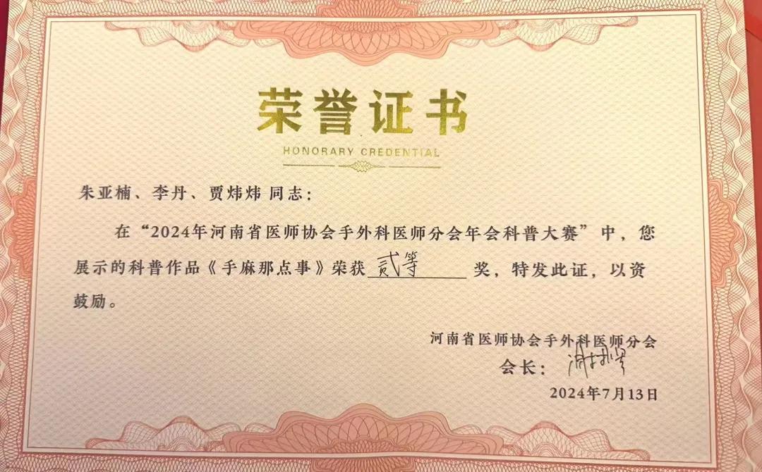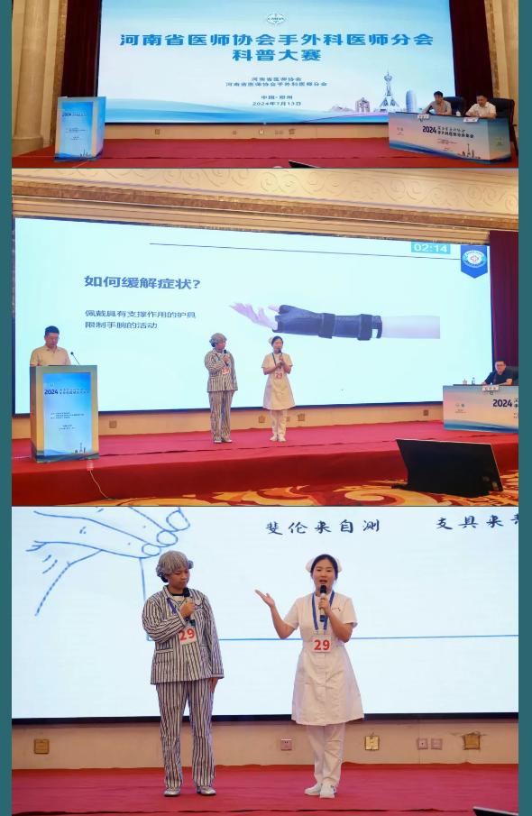 下午,在“2024年河南省醫(yī)師協(xié)會(huì)手外科醫(yī)師分會(huì)年會(huì)科普大賽”上,來(lái)自全省各地的精英選手們以生動(dòng)多樣的形式,將復(fù)雜的醫(yī)學(xué)知識(shí)轉(zhuǎn)化為易于理解、貼近生活的科普內(nèi)容,展現(xiàn)了手外科醫(yī)學(xué)的魅力與溫度。經(jīng)過(guò)激烈角逐,漯河市骨科醫(yī)院(漯河醫(yī)專二附院、漯河市立醫(yī)院)副主任醫(yī)師代彭威、護(hù)師李丹、護(hù)士賈煒煒榮獲二等獎(jiǎng)。他們?cè)诠ぷ髦?,以《腕管綜合征》為題積極準(zhǔn)備,認(rèn)真撰寫演講材料、精心制作演講幻燈片、反復(fù)推敲演練,對(duì)腕管的高發(fā)人群以及怎么預(yù)防怎么鍛煉,進(jìn)行了生動(dòng)形象的專題講解。在高手云集的大賽中榮獲優(yōu)異成績(jī),充分展示了漯河市骨科醫(yī)院手外科團(tuán)隊(duì)在學(xué)術(shù)研究與科普傳播方面的雙重實(shí)力。