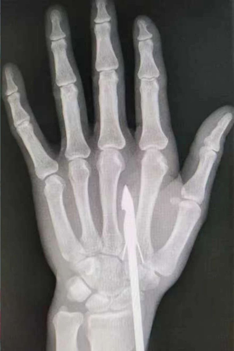 時(shí)間緊迫,每一秒的流逝都可能對(duì)傷者的手部功能造成不可逆的損害。接診醫(yī)生代彭威,迅速對(duì)傷者進(jìn)行了初步檢查。他注意到,魚鉤已經(jīng)深深嵌入皮膚,情況遠(yuǎn)比表面看起來復(fù)雜。沒有絲毫猶豫,立即安排了X線檢查以確認(rèn)魚鉤的位置及傷及范圍,以及急診化驗(yàn)檢查以評(píng)估患者的整體狀況。