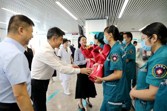 在急診科,宋耀生書記、于宏副主任向急救人員送上鮮花,對(duì)他們?cè)诩本染仍捅U先嗣裆】捣矫嫠龀龅呢暙I(xiàn)表示肯定。“急診科是衛(wèi)健系統(tǒng)和醫(yī)院的前沿陣地,你們時(shí)刻待命,聞令出擊,為患者救治爭(zhēng)分奪秒,大家辛苦了!”領(lǐng)導(dǎo)的話語(yǔ)溫暖著每一位急診醫(yī)師的心。