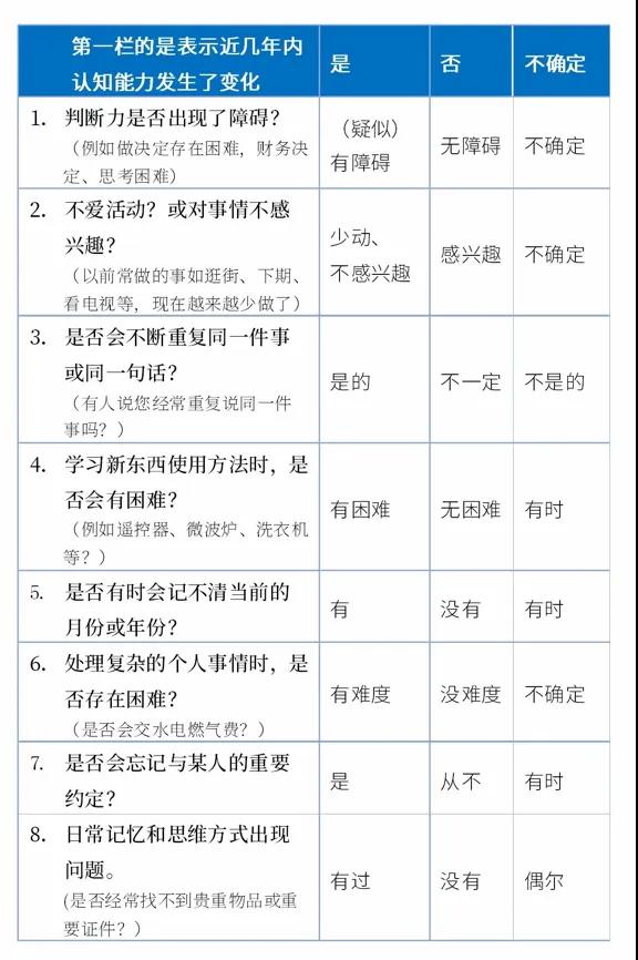 目前比較常用的是AD8癡呆篩查量表,它通過8個(gè)簡(jiǎn)單的問題,快速評(píng)估是否有阿爾茨海默病風(fēng)險(xiǎn)。如果出現(xiàn)2個(gè)及以上的表現(xiàn),則要及時(shí)到醫(yī)院就診咨詢,進(jìn)一步明確診斷。 (殷旭芳)
