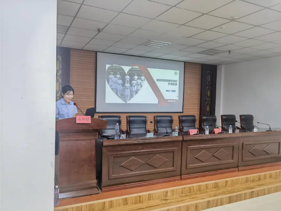 講座中,主管護師孟亞超通過一例糖尿病視網(wǎng)膜病變患者的實例,巧妙引出講座主題《糖尿病視網(wǎng)膜病變患者的術(shù)后護理查房》。她詳細介紹了護理查房的內(nèi)容、規(guī)范化流程以及如何去分析查房的重點問題和有效的實施相關(guān)護理措施。