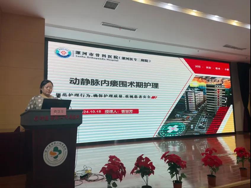 精心的圍手術(shù)期護(hù)理,可以減少手術(shù)并發(fā)癥,提高手術(shù)成功率,曹慧芳主任以《動(dòng)靜脈內(nèi)瘺圍術(shù)期護(hù)理》為題詳細(xì)闡述了患者評(píng)估與準(zhǔn)備、手術(shù)過(guò)程與護(hù)理配合、術(shù)后護(hù)理與觀察、藥物治療與護(hù)理、心理護(hù)理等內(nèi)容。