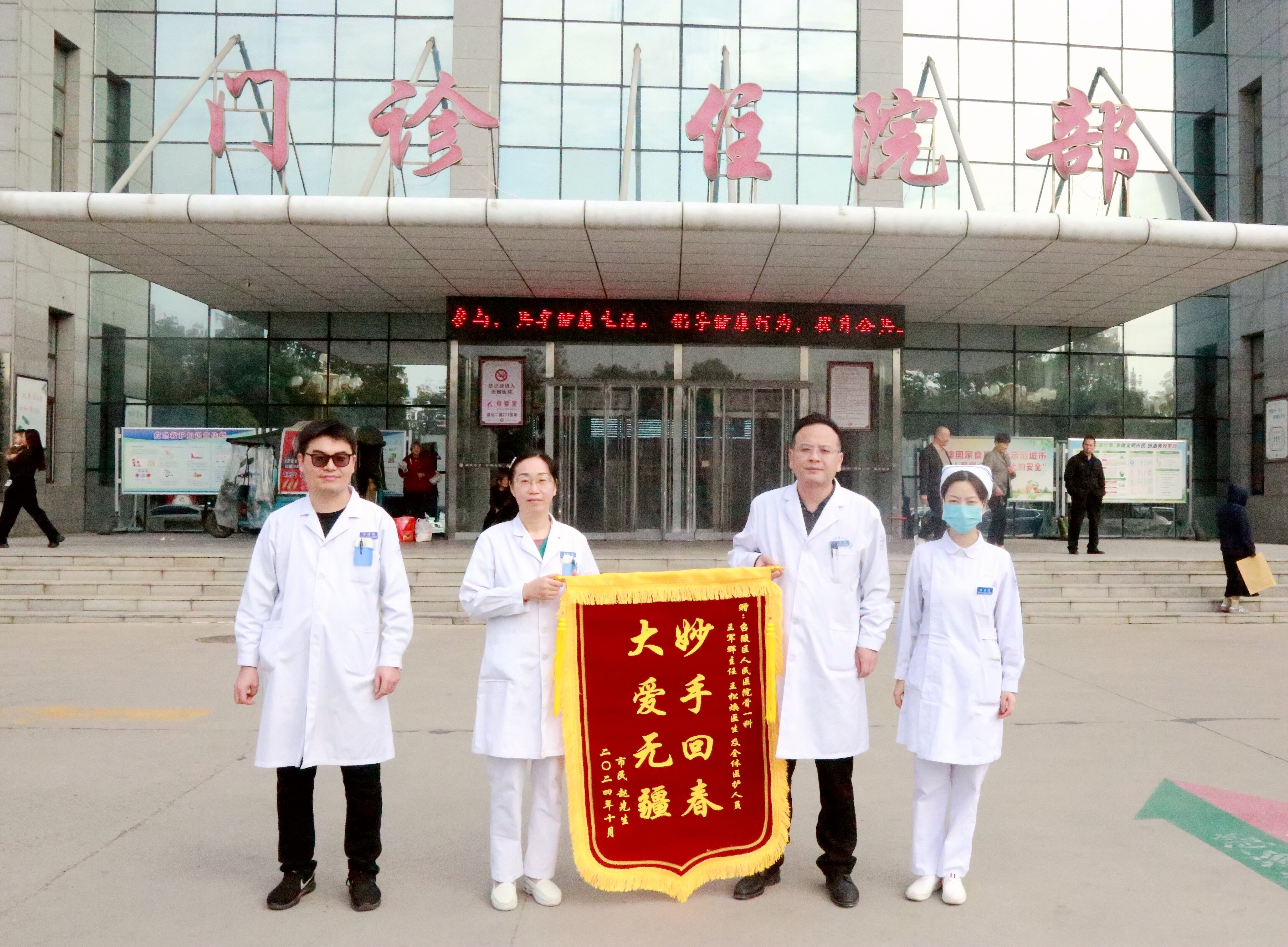 “醫(yī)生,今天我就能順利出院了,真是太感謝你們了!”10月25日上午,召陵區(qū)人民醫(yī)院,一位即將出院的患者為骨科一病區(qū)送來(lái)一面上書(shū)金燦燦“妙手回春 大愛(ài)無(wú)疆”大字的錦旗,感謝全體醫(yī)護(hù)人員的精心醫(yī)治。