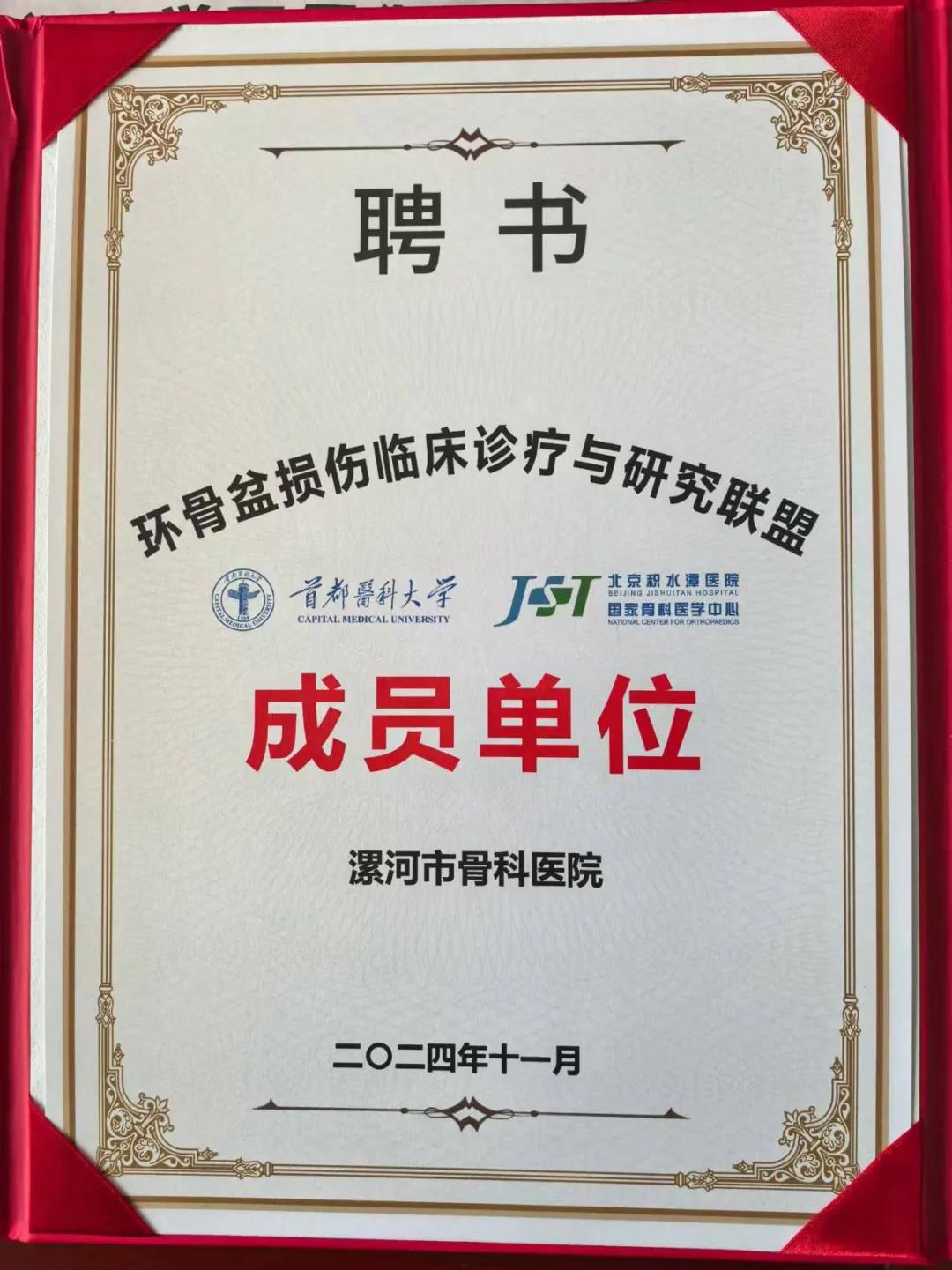 此次受邀加入該聯(lián)盟,為我院環(huán)骨盆損傷治療的進(jìn)一步發(fā)展提供了重要契機,也標(biāo)志著我院在骨盆微創(chuàng)救治領(lǐng)域邁上新臺階。未來,漯河市骨科醫(yī)院將充分發(fā)揮聯(lián)盟成員優(yōu)勢,與聯(lián)盟各單位實現(xiàn)資源共享、優(yōu)勢互補、協(xié)同發(fā)展,并以此推動本院以及漯河市及周邊地區(qū)環(huán)骨盆損傷臨床診療領(lǐng)域的高質(zhì)量發(fā)展,造福更多的患者。(盧 闖 劉 旭 袁錦鈺)