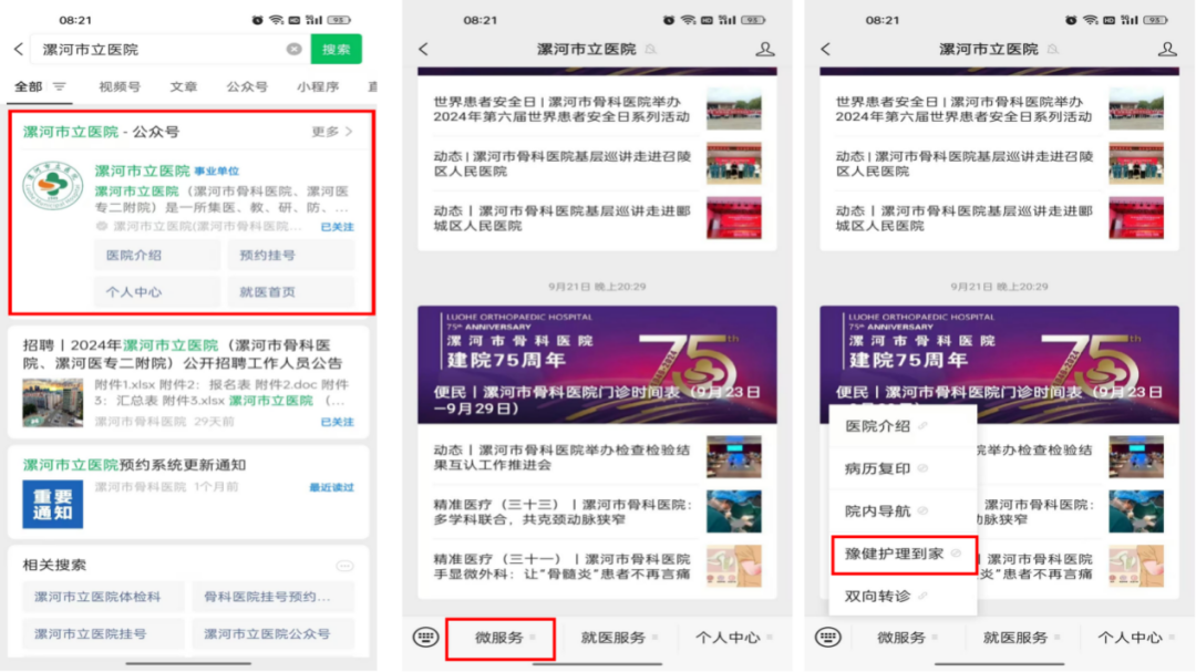 1.微信公眾號搜索“漯河市立醫(yī)院”,進(jìn)入公眾號點擊“微服務(wù)”,選擇“豫健護(hù)理到家”。