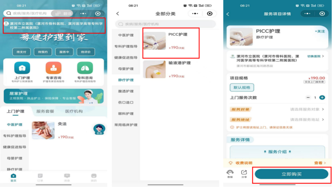 2.進(jìn)入后查看醫(yī)院是否正確,以下內(nèi)容以PICC護(hù)理為例:選擇PICC護(hù)理,點擊立即購買。