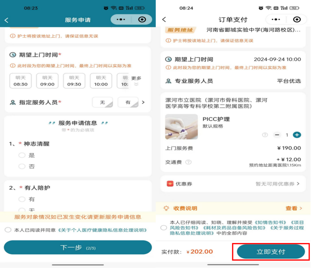 4.各項信息填寫后,支付訂單,護(hù)士接單后會與下單人電話聯(lián)系再次確認(rèn)。