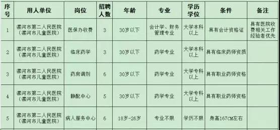 漯河市第二人民醫(yī)院(漯河市兒童醫(yī)院)因工作需要,需委托第三方以勞務派遣形式公開招聘醫(yī)保辦收費、臨床藥學、藥房調(diào)劑、靜配中心、病人服務中心等崗位人員共計23名,具體如下: