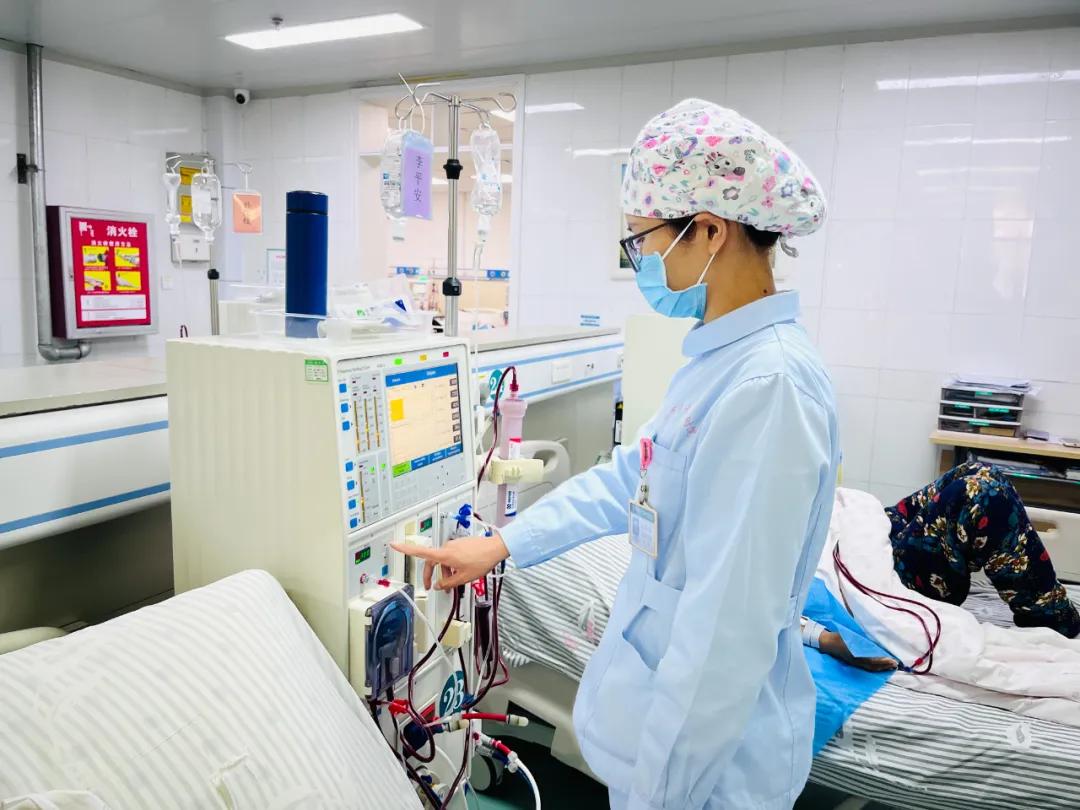 血液凈化室是一個安靜的地方。透析機發(fā)出的“嘀嗒”聲和患者的呼吸聲成為這里獨特的旋律。每天早上7點,我會準時到崗,檢查機器、配制抗凝劑等,做好患者上機前的準備工作;透析過程中,認真監(jiān)測患者生命體征……對每一個步驟都嚴謹細致。在這個沒有硝煙的戰(zhàn)場上,我時刻保持警惕,為患者健康盡心盡力。
