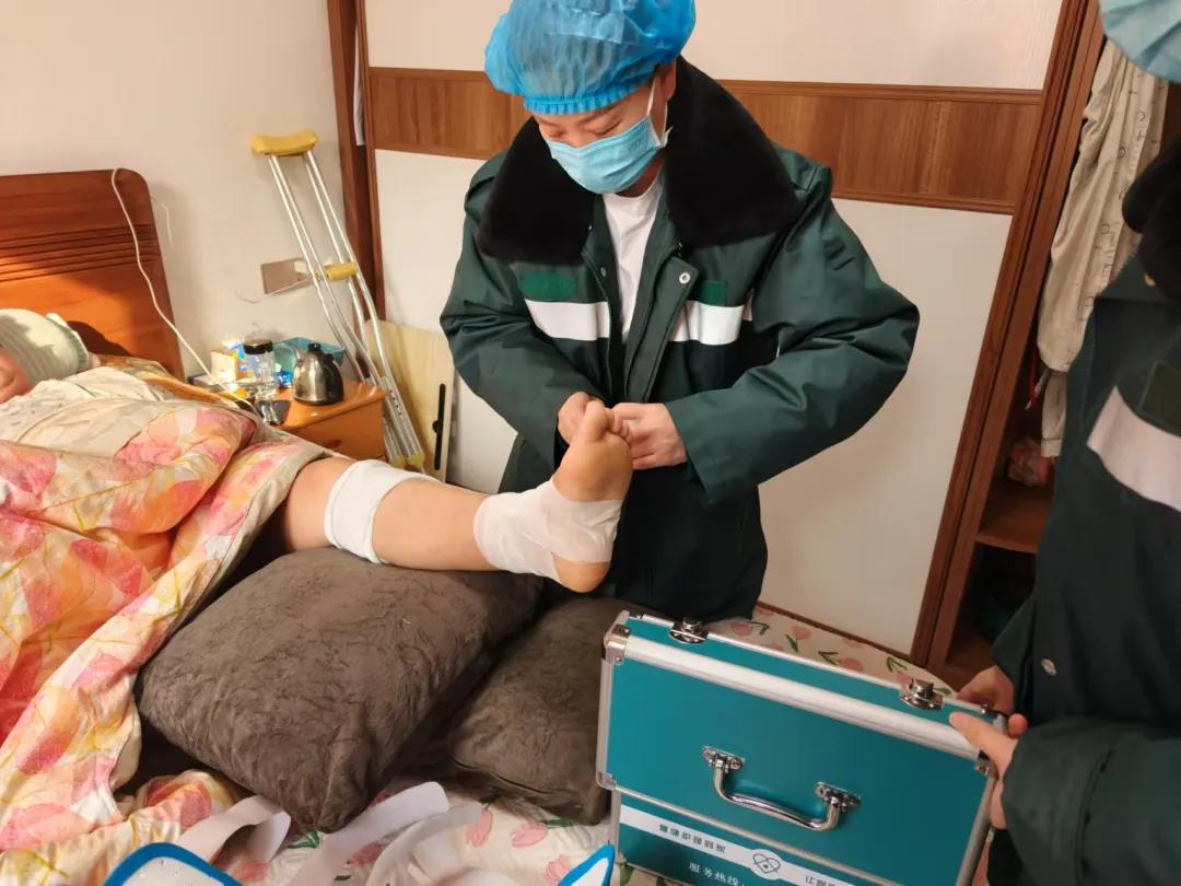 接到任務(wù)后,張燕燕護(hù)士長(zhǎng)帶領(lǐng)科室主管護(hù)師孟丹丹一起按照約定時(shí)間上門(mén)服務(wù),在對(duì)患者做了系統(tǒng)的傷口評(píng)估后,嚴(yán)格按照操作標(biāo)準(zhǔn),動(dòng)作輕柔又利落地對(duì)傷口進(jìn)行了創(chuàng)面消毒、換藥、包扎,同時(shí)耐心為患者及家屬講解了傷口居家護(hù)理的注意事項(xiàng)及患肢的功能鍛煉要點(diǎn)等。