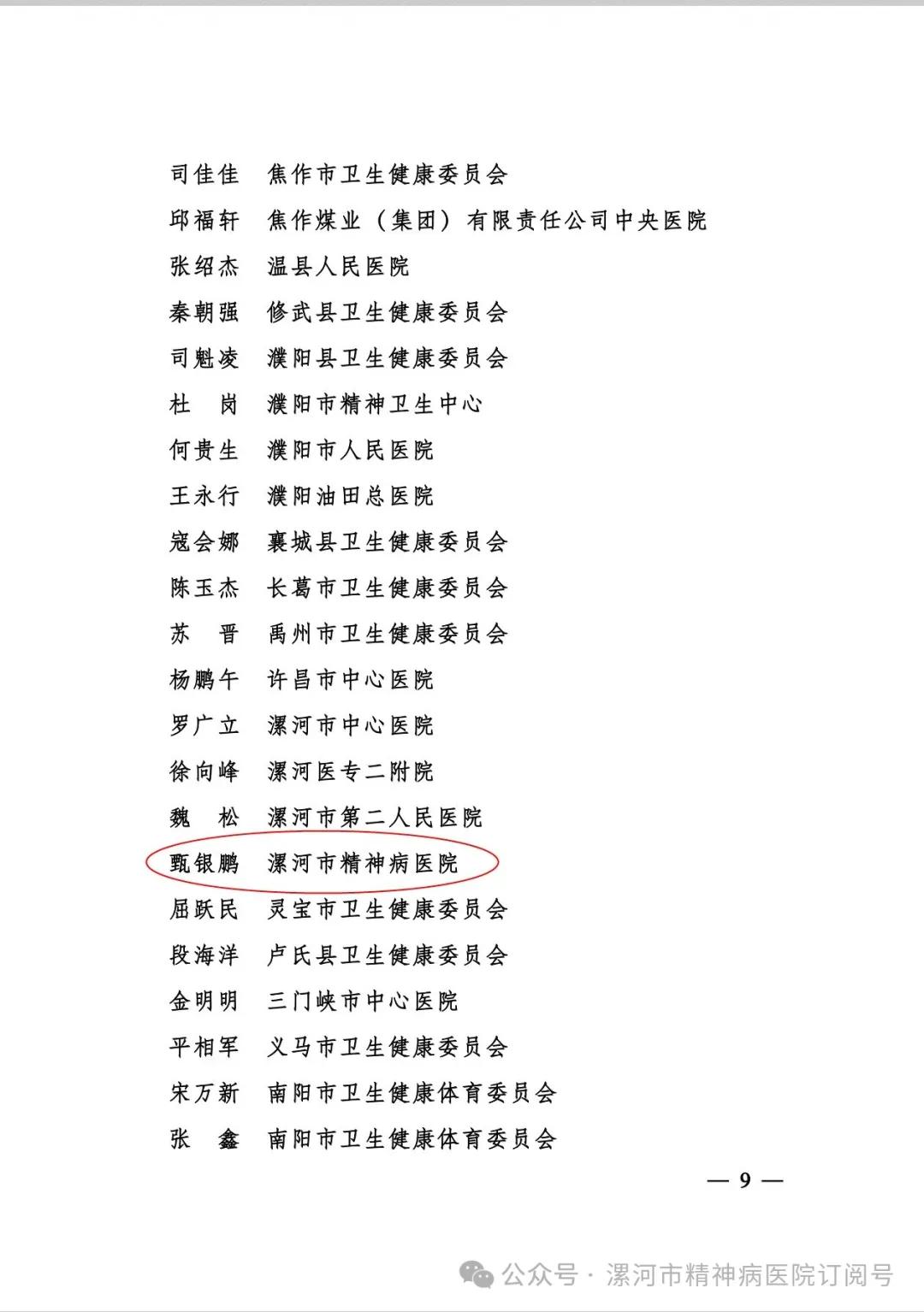 近日河南省健康委員會(huì)關(guān)于表揚(yáng)2024年度全省醫(yī)政和護(hù)理工作表現(xiàn)突出集體和個(gè)人的通報(bào)中,漯河市精神病醫(yī)院醫(yī)務(wù)科科長甄銀鵬榮獲“全省醫(yī)政工作表現(xiàn)突出個(gè)人”