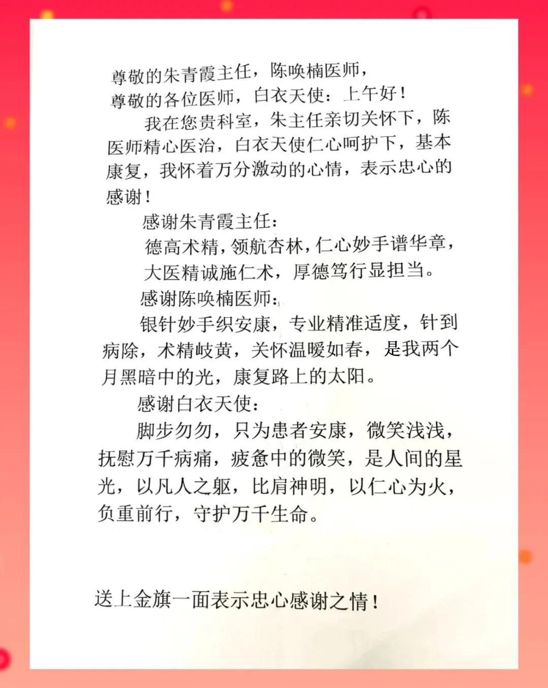 近日,市二院中醫(yī)針灸科門診醫(yī)護(hù)人員一如既往地忙碌著。突然,走廊里傳來一陣熱烈的掌聲,原來,74歲的田大叔在家人陪伴下,手捧錦旗和感謝信來到醫(yī)院。田大叔激動地展開感謝信,聲情并茂地朗讀起來,說到動情處更是眼含熱淚,字里行間飽含著對中醫(yī)針灸科主任朱青霞的誠摯謝意和對整個醫(yī)護(hù)團(tuán)隊精湛醫(yī)術(shù)與暖心服務(wù)的認(rèn)可與贊美。讀完,田大叔深深地鞠躬致謝,這一躬身,更是見證中醫(yī)針灸科‘破冰’三十年病痛,醫(yī)患同心最好的詮釋。