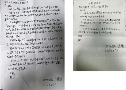 在漯河醫(yī)專二附院泌尿-肛腸外科全體醫(yī)護(hù)人員的精心治療和悉心照料下,患者術(shù)后恢復(fù)良好,順利出院。出院之際,患者特意寫下兩張感謝信,分別贈(zèng)予閆衛(wèi)甫主任團(tuán)隊(duì)和護(hù)理團(tuán)隊(duì)。信中,老人深情地寫道:“你們用專業(yè)的技術(shù),耐心的關(guān)懷,讓我再在病痛中感到了安心,看到了希望,你們不僅用醫(yī)術(shù)守護(hù)健康,更用真誠撫慰了患者的心靈。”(盧闖 田向榮 劉旭 袁錦鈺)