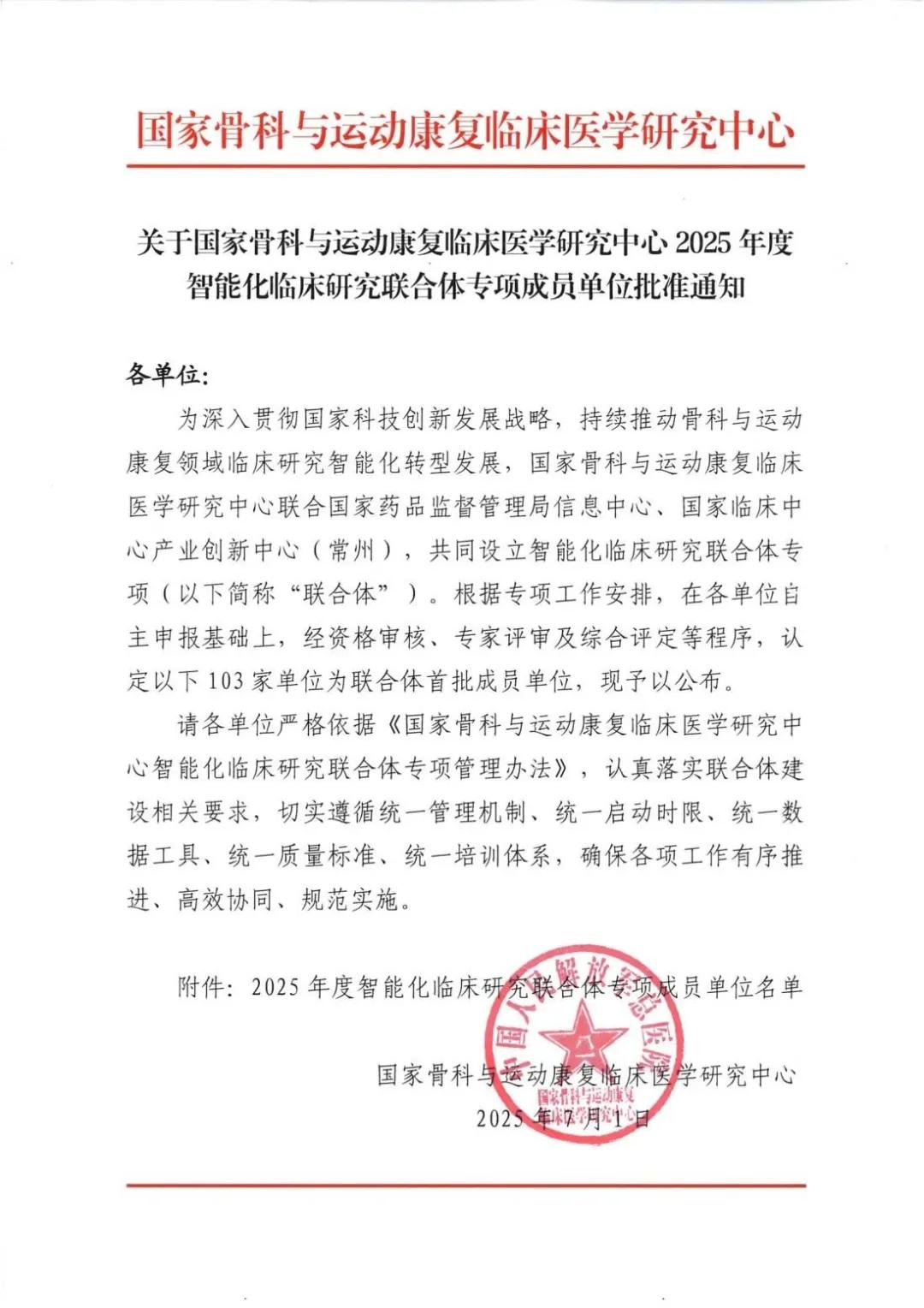 由國家骨科與運動康復臨床醫(yī)學研究中心(以下簡稱“國家臨床中心”)聯(lián)合國家藥品監(jiān)督管理局信息中心、國家臨床中心產(chǎn)業(yè)創(chuàng)新中心(常州)共同設(shè)立的“2025年度智能化臨床研究聯(lián)合體專項”已完成首批成員單位遴選,共103家單位成功入選(具體名單見文末附件),覆蓋全國26個省份。 其中漯河醫(yī)專二附院成功入選國家臨床中心“智能化臨床研究聯(lián)合體專項”首批成員單位