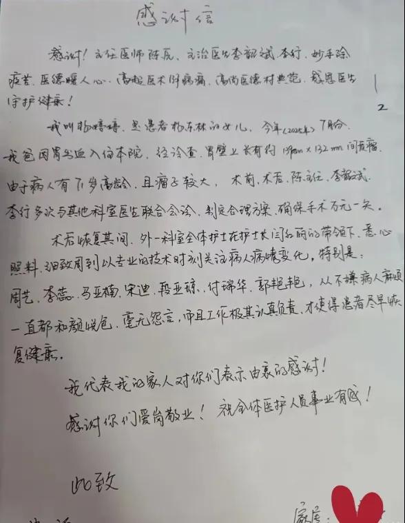 這封感謝信,是對普通外科全體醫(yī)護人員,尤其是對護理團隊辛勤付出和專業(yè)精神的高度認可與鼓勵。對團隊而言,患者的康復和家屬的滿意是他們最大的追求。普通外科團隊將繼續(xù)秉承“以患者為中心”的服務理念,不斷精進醫(yī)療技術,提升護理服務質量,尤其是加強復雜、高齡患者圍手術期的精細化、人性化護理管理,用精湛的醫(yī)術祛除病痛,用溫暖的仁心守護健康,為更多患者帶來康復的希望和家的溫暖。(盧 闖 閆紅麗 劉 旭 袁錦鈺)