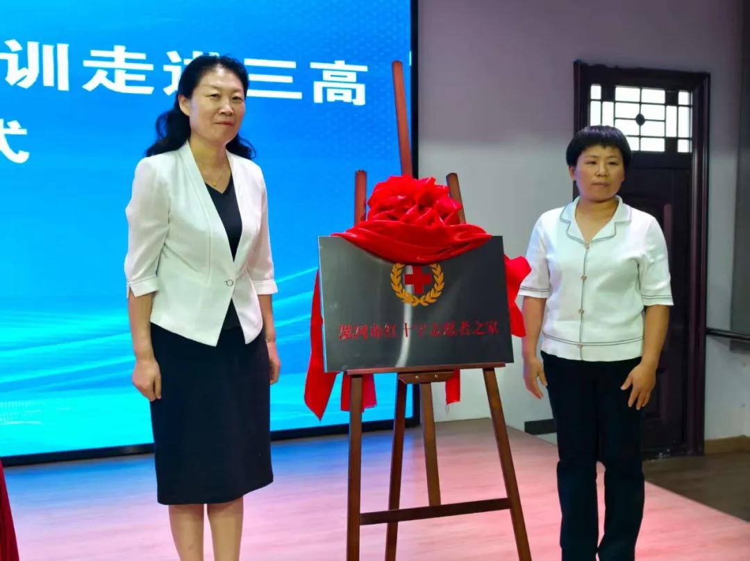 現(xiàn)場,郭俊偉向“漯河市第三高級中學(xué)紅十字應(yīng)急救護(hù)社團(tuán)”代表授旗,孫潁華和胡海英共同為“紅十字志愿者之家”揭牌。