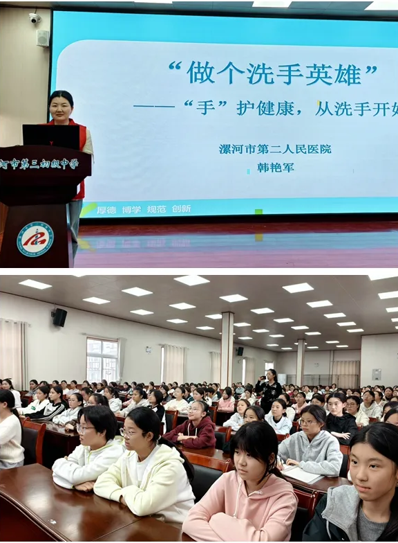 此外,市二院感控辦工作人員專程走進(jìn)市第三初級(jí)中學(xué),為學(xué)生們帶來(lái)了一場(chǎng)別開(kāi)生面的手衛(wèi)生知識(shí)講座。工作人員以“手”護(hù)健康為切入點(diǎn),通過(guò)專題講座、播放宣傳視頻、講解洗手重要性、演示“七步洗手法”等環(huán)節(jié),深入淺出地向同學(xué)們闡述了洗手這一最簡(jiǎn)單、經(jīng)濟(jì)且有效的健康守護(hù)方法,有效提升了青少年群體的手衛(wèi)生知識(shí)與自我防護(hù)能力。
