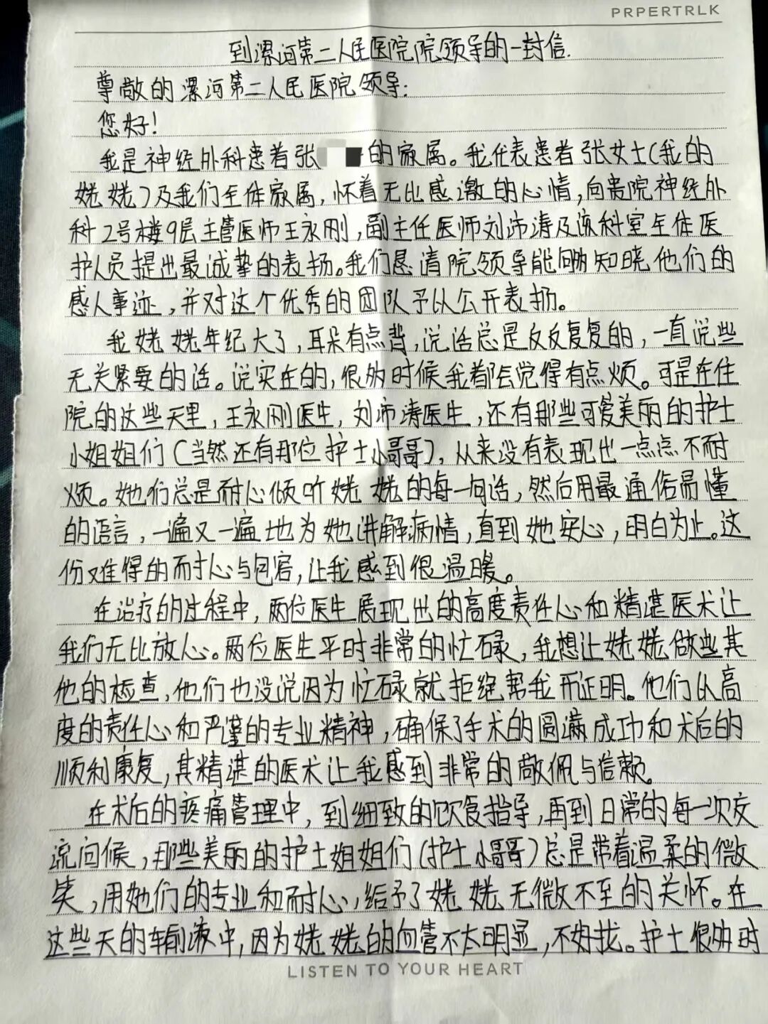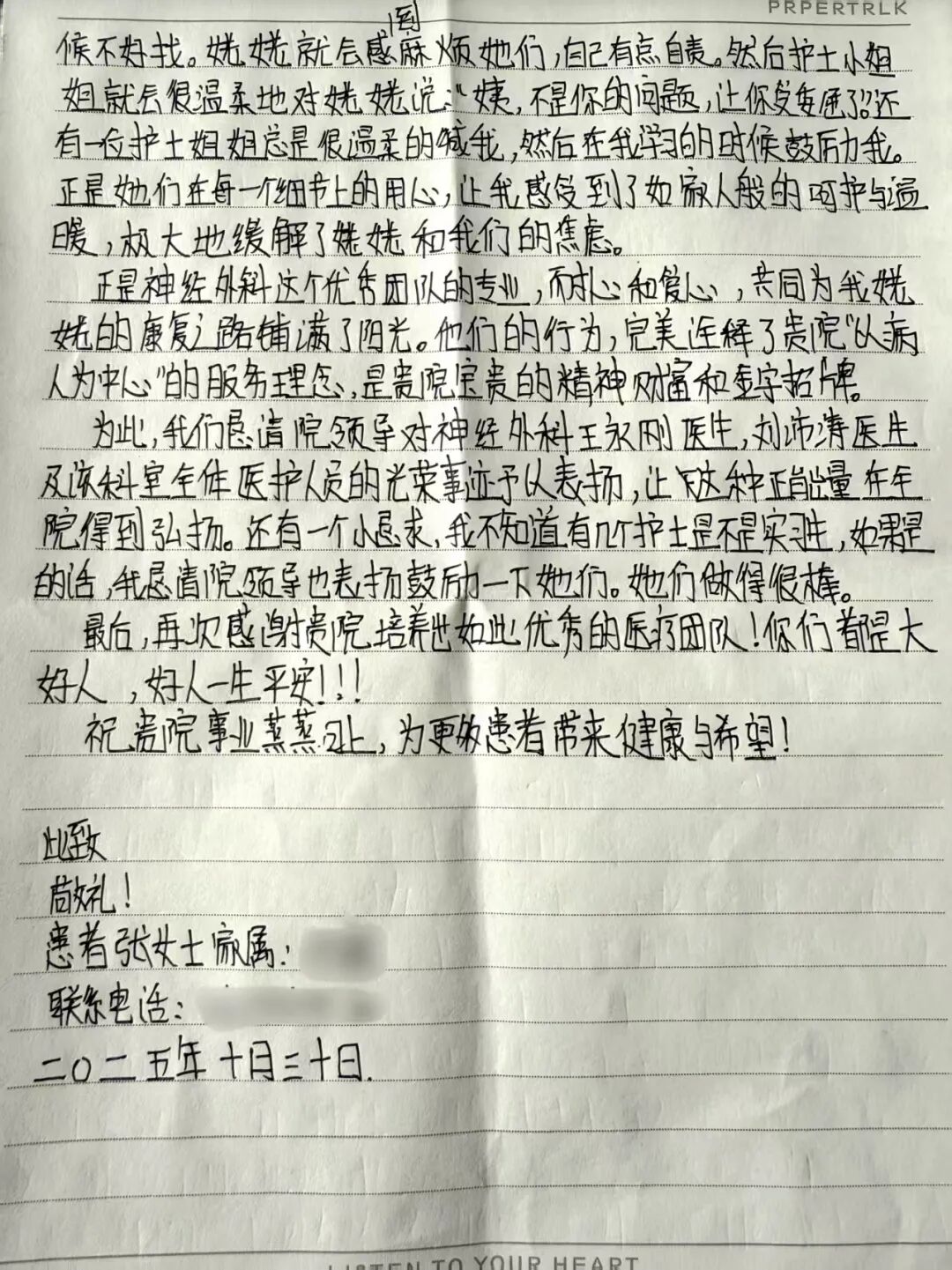 據(jù)了解,張女士的姥姥因“背部腫物”一直備受困擾,6年前在其他醫(yī)院手術(shù)治療后效果不佳,1年內(nèi)復(fù)發(fā),腫物逐漸增大,并出現(xiàn)肩部活動受限伴肩部疼痛。來到市二院后神經(jīng)外科醫(yī)生立即進(jìn)行手術(shù),因術(shù)中腫物與周圍組織粘連嚴(yán)重,手術(shù)歷時近2個小時,術(shù)后恢復(fù)良好。“我的姥姥年紀(jì)大了,耳朵有點(diǎn)背,說話總是反反復(fù)復(fù),啰啰嗦嗦的。說實(shí)在的,有時候我都會覺得有點(diǎn)煩。可是從住院以來,劉沛濤主任、王永剛醫(yī)生,還有那些美麗可愛的護(hù)士小姐姐們和帥氣的護(hù)士小哥哥,從來沒有表現(xiàn)出一點(diǎn)點(diǎn)不耐煩。他們總是耐心地聽姥姥講,一遍遍地解釋給她聽,直到她聽懂為止。”張女士的表揚(yáng)信中字里行間包含著對神經(jīng)外科整個醫(yī)護(hù)團(tuán)隊暖心服務(wù)的認(rèn)可與贊美。