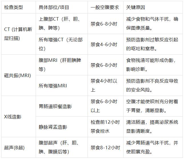 為了方便您快速查閱,以下表格總結(jié)了常見(jiàn)需要空腹的影像檢查類別。