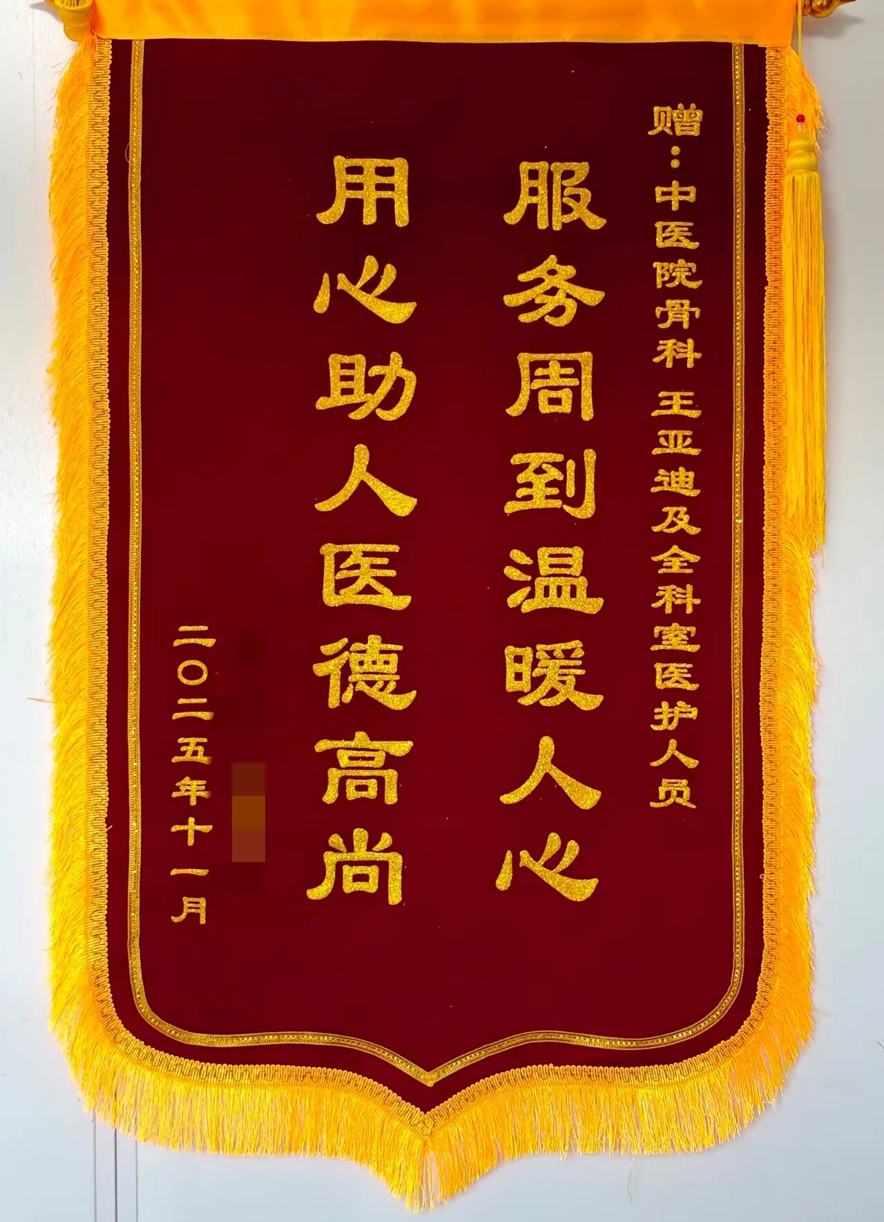 “你們不僅醫(yī)術(shù)高超,還特別有耐心,讓我感受到了家人般的溫暖。” 送錦旗時(shí),黃女士反復(fù)說著感謝。面對(duì)贊譽(yù),主管醫(yī)生王亞迪笑著回應(yīng):“這是我們醫(yī)務(wù)人員應(yīng)該做的,看到患者康復(fù),就是我們最大的心愿。” 一面錦旗,不僅是患者對(duì)醫(yī)護(hù)團(tuán)隊(duì)的認(rèn)可,更是醫(yī)患之間濃濃真情的見證。(骨 科 王亞迪)