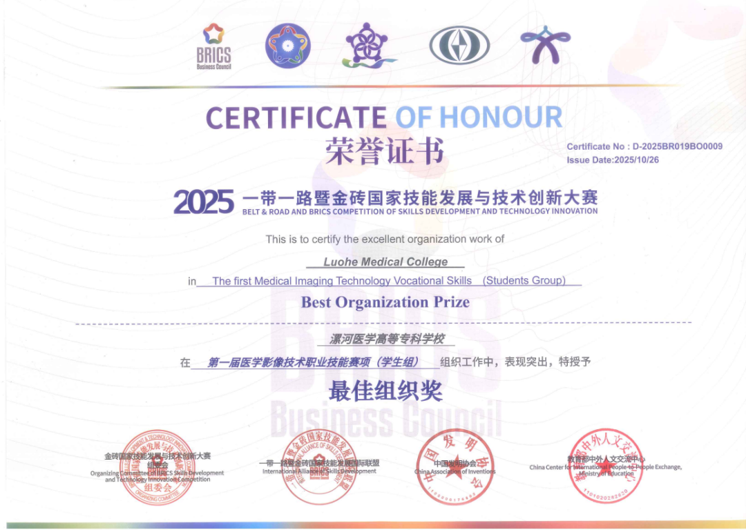 教師團(tuán)隊亦表現(xiàn)不俗,孫英杰老師在“醫(yī)學(xué)影像教學(xué)創(chuàng)新賽項”中獲三等獎,王海波、劉曉梅、丁琦峰三位老師因在賽前指導(dǎo)中表現(xiàn)突出,被授予“優(yōu)秀指導(dǎo)教師”稱號。尤為值得一提的是,周山主任及其帶教團(tuán)隊因組織有序、動員充分、師生整體表現(xiàn)優(yōu)異,被大賽組委會授予“最佳組織獎”——這也是繼2025年9月第十二屆“泰山杯”全國醫(yī)學(xué)影像技術(shù)專業(yè)大學(xué)生實踐技能大賽以來,漯河醫(yī)專二附院醫(yī)學(xué)影像教學(xué)團(tuán)隊又一次參加此項全國性的醫(yī)學(xué)影像技術(shù)專業(yè)實踐技能大賽的優(yōu)異成績。