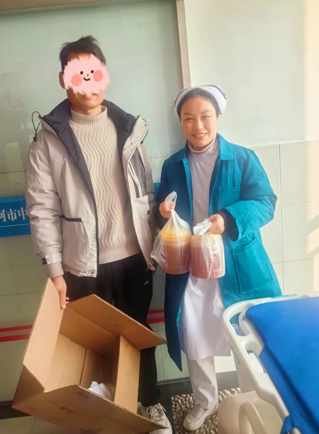 12月11日,患者復(fù)查時,把蜂蜜送到同事們手中,他臉上露出了久違的笑容。并對醫(yī)院以及同事們給予的關(guān)愛表達了深深的感謝。