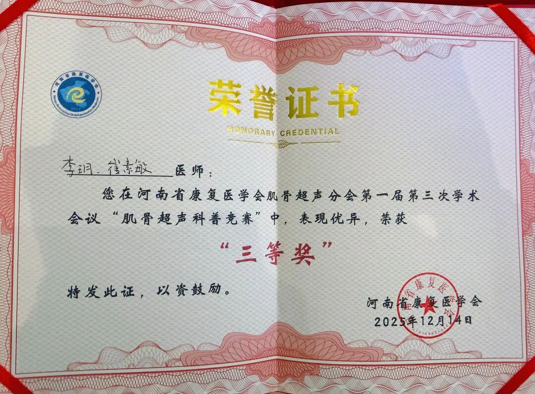 漯河市中醫(yī)院康復(fù)院區(qū)李玥、崔素敏榮獲省康復(fù)醫(yī)學(xué)會肌骨超聲分會科普競賽三等獎
