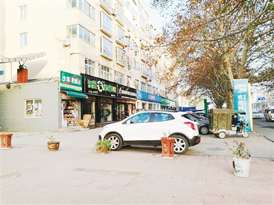 昨日下午,記者來到網(wǎng)友“波杰克”所說的沙河景苑小區(qū),看到位于門口一側(cè)的路面上整齊地放置了一排花盤,花盤的大小、形狀并不完全相同。有了這排花盆的阻擋,一輛白色的SUV只能??吭诨ㄅ柰庖粋?cè)。