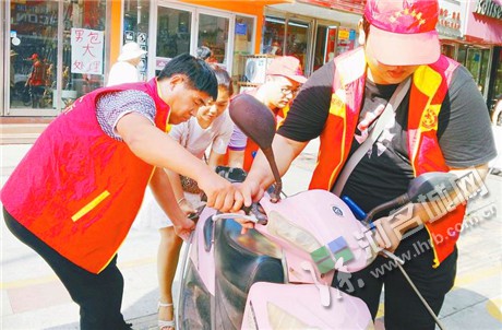 志愿者在馬路街對(duì)商戶落實(shí)“門前三包”情況進(jìn)行督導(dǎo),發(fā)現(xiàn)問題現(xiàn)場解決。 漯河日報(bào)全媒體記者 范子恒 攝