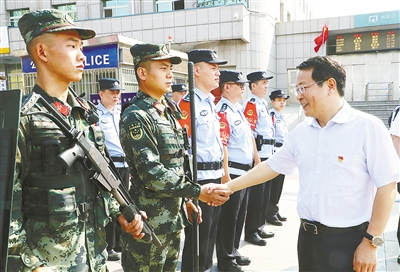 10月2日,市委書記蒿慧杰在火車站廣場(chǎng)看望節(jié)假日期間奮戰(zhàn)在一線的公安干警。記者 王慶建攝