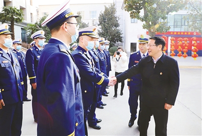 蒿慧杰、李建濤、陳先勝、陳平、李軍信、田冠亭一行先后來到市消防救援支隊(duì)、武警漯河支隊(duì),了解節(jié)日安排、值班值守等情況。蒿慧杰指出,一直以來,市消防救援支隊(duì)和武警漯河支隊(duì)為維護(hù)漯河安全穩(wěn)定、促進(jìn)高質(zhì)量發(fā)展作出了積極貢獻(xiàn)。實(shí)踐證明,市消防救援支隊(duì)和武警漯河支隊(duì)均是召之即來、來之能戰(zhàn)、戰(zhàn)之必勝的隊(duì)伍,也是讓黨委、政府放心,讓人民群眾滿意的隊(duì)伍。我代表市委市政府向廣大消防指戰(zhàn)員和武警官兵的辛勤付出、無私奉獻(xiàn)表示慰問和感謝。今年是“十四五”開局之年,我市改革發(fā)展穩(wěn)定各項(xiàng)工作任務(wù)繁重,希望全體消防指戰(zhàn)員和武警官兵繼續(xù)發(fā)揚(yáng)“舍小家為大家”的優(yōu)良傳統(tǒng)和工作作風(fēng),完善工作機(jī)制,加強(qiáng)隊(duì)伍建設(shè),提升戰(zhàn)斗能力,扎實(shí)做好戰(zhàn)備執(zhí)勤、維穩(wěn)處突、消防安全等各項(xiàng)工作,在服務(wù)地方經(jīng)濟(jì)社會(huì)發(fā)展、維護(hù)人民群眾生命財(cái)產(chǎn)安全上再立新功。市委、市政府將一如既往地支持駐漯部隊(duì)、武警部隊(duì)、消防隊(duì)伍的各項(xiàng)建設(shè),始終如一地幫助廣大官兵和消防指戰(zhàn)員解決實(shí)際困難。