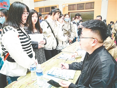 招聘單位代表與畢業(yè)生現(xiàn)場(chǎng)交流互動(dòng)。