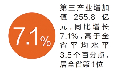 分產(chǎn)業(yè)看,三次產(chǎn)業(yè)增加值增速全面領(lǐng)先。第一產(chǎn)業(yè)增加值18.4億元,同比增長2.9%,高于全省平均水平0.3個(gè)百分點(diǎn),居全省第四位;第二產(chǎn)業(yè)增加值189.2億元,同比增長11.7%,高于全省平均水平5個(gè)百分點(diǎn),居全省第二位;第三產(chǎn)業(yè)增加值255.8億元,同比增長7.1%,高于全省平均水平3.5個(gè)百分點(diǎn),居全省第一位。