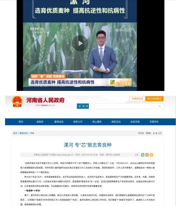 2024年,在市級(jí)以上媒體宣傳報(bào)道90余篇?!秾?ldquo;芯”致志育良種》被省政府官網(wǎng)報(bào)道,科技服務(wù)春耕春管工作被《河南日?qǐng)?bào)》《科技日?qǐng)?bào)》報(bào)道,《選育優(yōu)質(zhì)麥種提高抗逆性和抗病性》小麥新品種選育工作4月26日被央視報(bào)道。