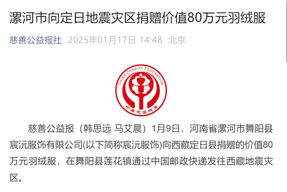 1月9日,河南宸沅服飾有限公司總經(jīng)理李書鋒聯(lián)系市縣慈善總會(huì),捐贈(zèng)價(jià)值80萬(wàn)元的羽絨服,通過中國(guó)郵政快遞專車發(fā)往西藏災(zāi)區(qū)。