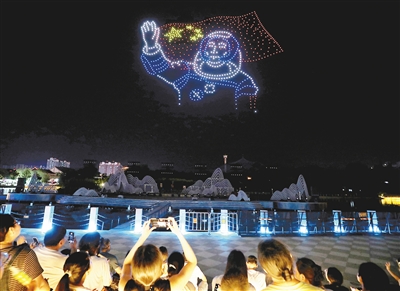 8月21日晚8時許,千架無人機在河上街景區(qū)騰空而起,瞬間點亮夜空?;鸺?、身著航天服在太空漫步的宇航員、繞地球飛行的天宮空間站……當(dāng)晚的千機飛“只有漯河”展演活動,以“太空之旅”為主題,吸引了眾多市民和游客。記者看到,市民、游客紛紛舉起手機、相機,定格精彩瞬間(如圖)。