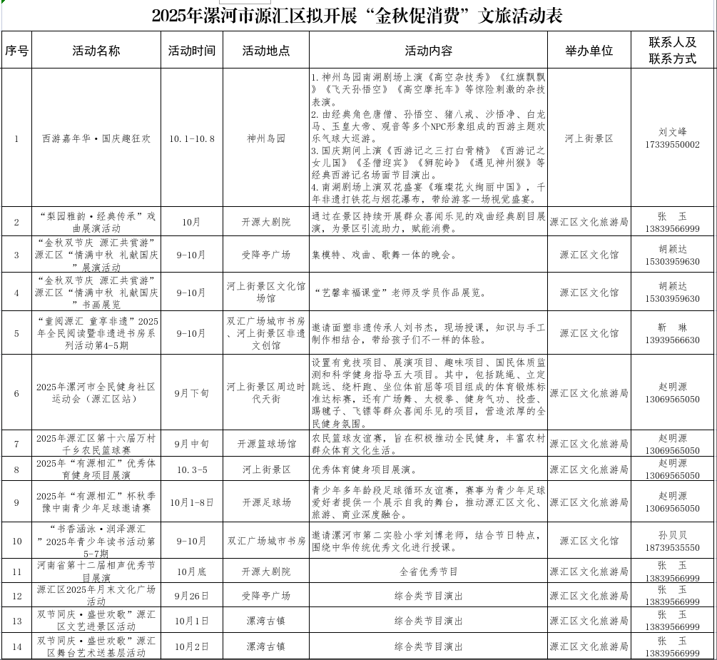 為深入貫徹落實國家、省、市關(guān)于促進(jìn)文旅消費的決策部署,進(jìn)一步激發(fā)全區(qū)文旅市場活力、提振消費信心、點燃群眾消費熱情,拉動文旅消費增長,源匯區(qū)文旅局采取三項有力措施,精心籌備并扎實推進(jìn)金秋文旅消費季活動。