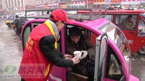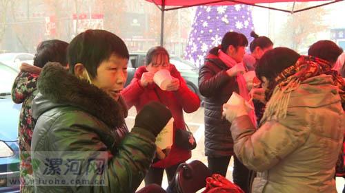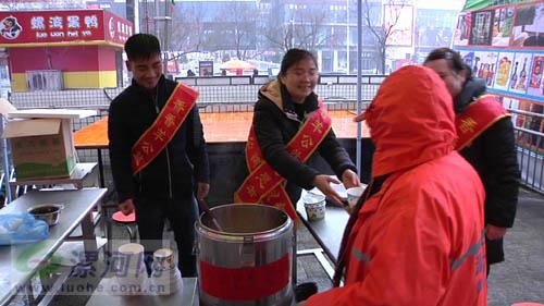 煙廠花園也是我市的人流密集區(qū)域,雖然天上飄著小雨,但仍有大批的愛心志愿者在這里忙碌著,他們正在為過往的市民送上一碗碗熱氣騰騰的愛心粥。除此之外,在丹尼斯、火車站廣場這些漯河最繁華的地段,這里的志愿者從早上七點就開始準(zhǔn)備了,他們說,這些粥不僅要為大家?guī)矶盏臏嘏?,也要送上?jié)日的祝福。