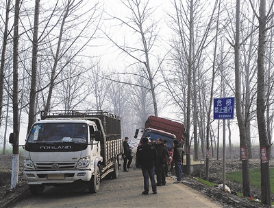 一座年久失修的危橋上設(shè)置了非常明顯的禁行標志,但是貨車仍從橋上駛過,不禁讓人揪心。這是記者1月8日在何冢路塔河橋上看到的一幕。