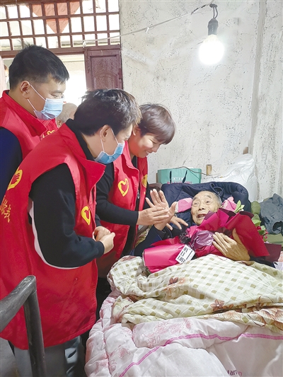 11月11日是舞陽(yáng)縣舞泉鎮(zhèn)中心街村高慶賀老人的百歲生日。漯河公益志愿者團(tuán)隊(duì)志愿者帶著生日蛋糕、鮮花及棉衣等來(lái)到老人家里,為他慶祝百歲生日。
