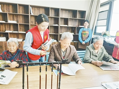 老人們?cè)诟珊雨惤值谰C合養(yǎng)老服務(wù)中心讀書看報(bào)。