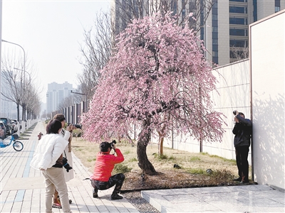 3月14日,在市區(qū)王屋山路蘇荷象灣壹號(hào)小區(qū)門前,兩株盛開(kāi)的龍梅形成兩團(tuán)巨大的粉色花簇,吸引不少市民圍觀拍照。