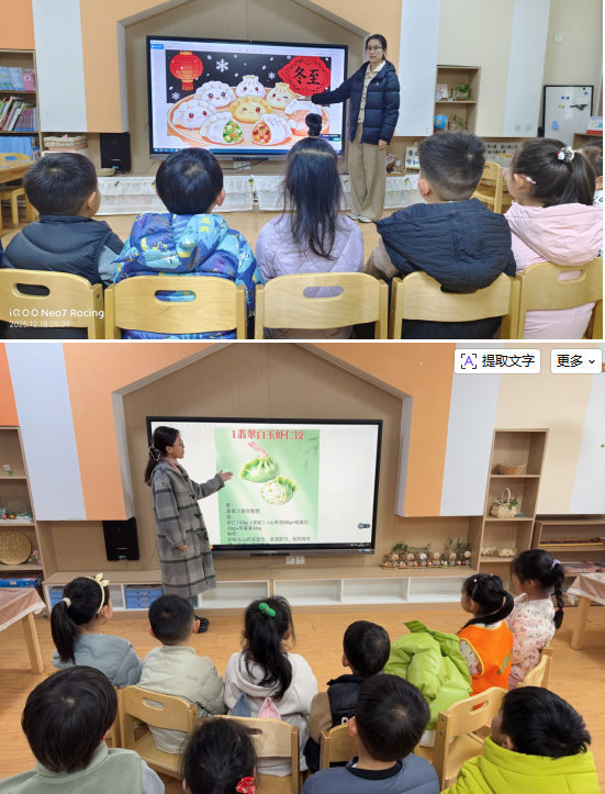 保健醫(yī)也走進(jìn)了大班課堂,將冬至文化知識(shí)與幼兒健康養(yǎng)護(hù)巧妙融合。立足幼兒冬季保健需求,保健醫(yī)具體示范“洋蔥式穿衣法”,強(qiáng)調(diào)飲食多樣與營養(yǎng)均衡,引導(dǎo)幼兒在了解習(xí)俗的同時(shí),建立科學(xué)防寒、健康飲食的自我防護(hù)意識(shí),讓傳統(tǒng)文化承載著關(guān)愛與智慧浸潤童心。